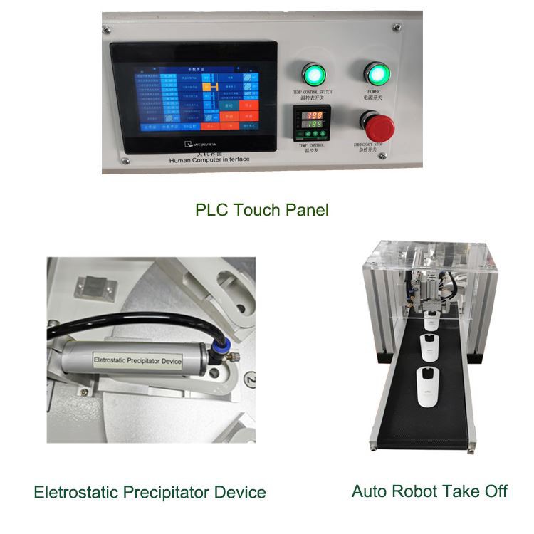 Для друку на пластмасових виробах вручну завантажуйте пластмасові вироби на конвеєр і автоматично вивантажуйте на конвеєр. Використання електростатичного пристрою для видалення пилу та сенсорної панелі PLC та індексу кулачка для високоточної роботи столу.